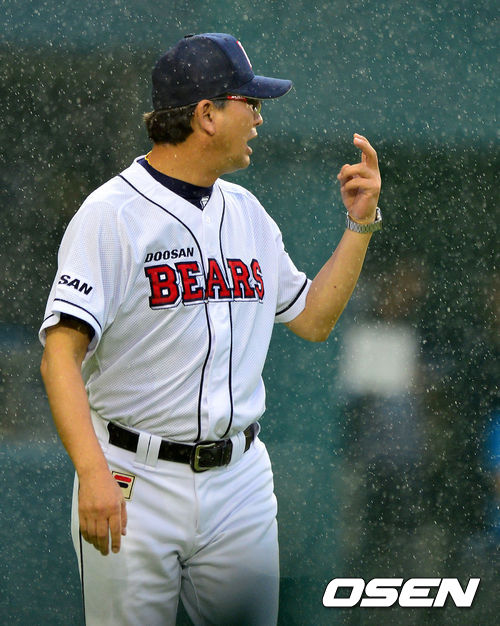 7일 오후 서울 잠실야구장에서 열린 '2013 한국야쿠르트 세븐 프로야구' 두산 베어스와 삼성 라이온즈의 경기, 1회말 2사 2루에서 비가 내리자 두산 김진욱 감독이 그라운드에 나와 구심과 이야기를 나누고 있다.