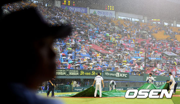 7일 오후 서울 잠실야구장에서 열린 '2013 한국야쿠르트 세븐 프로야구' 두산 베어스와 삼성 라이온즈의 경기, 1회말 2사 2루에서 우천으로 경기가 중단되며 그라운드에 방수포를 덮고 있다.