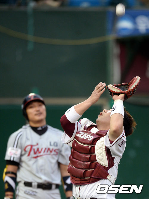 7일 오후 서울 목동 야구장에서 열린 '2013 한국야쿠르트 세븐 프로야구' 넥센 히어로즈와 LG 트윈스의 경기, 3회초 1사 3루 넥센 허도환이 LG 이진영의 타구를 잡아내고 있다.