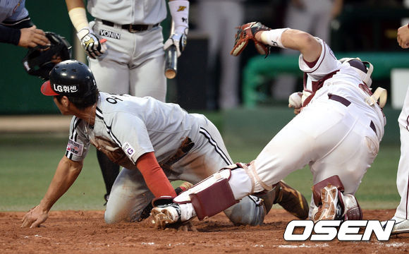 7일 오후 서울 목동 야구장에서 열린 '2013 한국야쿠르트 세븐 프로야구' 넥센 히어로즈와 LG 트윈스의 경기, 4회초 2사 3루 LG 오지환이 넥센 허도환이 공을 잡아다 놓친 사이에 홈으로 쇄도 득점을 올리고 있다.