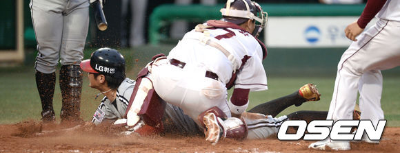 7일 오후 서울 목동 야구장에서 열린 '2013 한국야쿠르트 세븐 프로야구' 넥센 히어로즈와 LG 트윈스의 경기, 4회초 2사 3루 LG 오지환이 넥센 허도환이 공을 잡아다 놓친 사이에 홈으로 쇄도 득점을 올리고 있다.