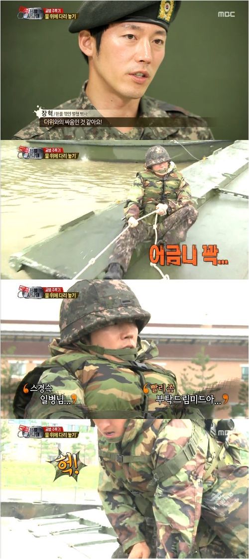 장혁은 7일 방송된 MBC 예능프로그램 ‘일밤-진짜 사나이’는 샘 해밍턴, 서경석 등과 함께 물위에 다리를 놓는 훈련을 받았다.