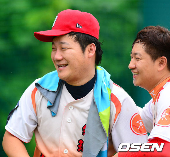 7일 오후 경기도 양평 야구장에서 열린 '제4회 니베아 맨 컵 전국생활체육 야구대회' 외인구단과 살세로스 경기를 마치고 외인구단의 감독겸 선수 개그맨 김현철이 동료들과 승리의 기쁨을 나누고 있다. 한편 이 경기에서 외인구단이 6-4로 승리를 거뒀다.