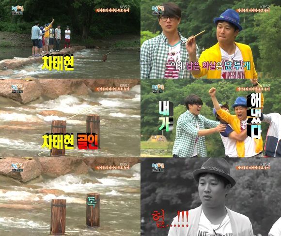 일한 팀이 이미 두 개의 화살을 넣은 상황에서 일을 하지 않은 팀인 차태현은 화살을 하나 넣었고, 화살은 통에 아슬아슬하게 매달려 있었다. 이를 지켜보던 주원은 "다시 쳐서 빠뜨리면 어떻게 되는 거냐"고 물었고, 멤버들은 "당연히 무효"라고 답했다. 대답을 하기가 무섭게 차태현은 화살을 던졌고, 곧 자신이 앞서 던졌던 화살을 계곡물에 빠뜨렸다.