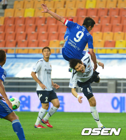 7일 오후 경기도 수원월드컵경기장에서 '2013 현대오일뱅크 K리그 클래식' 수원 삼성 대 울산 현대의 경기가 열렸다. 전반 수원 오장은과 울산 강민수가 골문 앞에서 헤딩 다툼을 벌이고 있다.