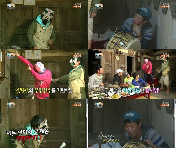 '1박2일' 이수근이 탈 춤을 추다 유해진에게 "어디서 구한 가면?"이냐고 너스레를 떨어 웃음을 자아냈다.