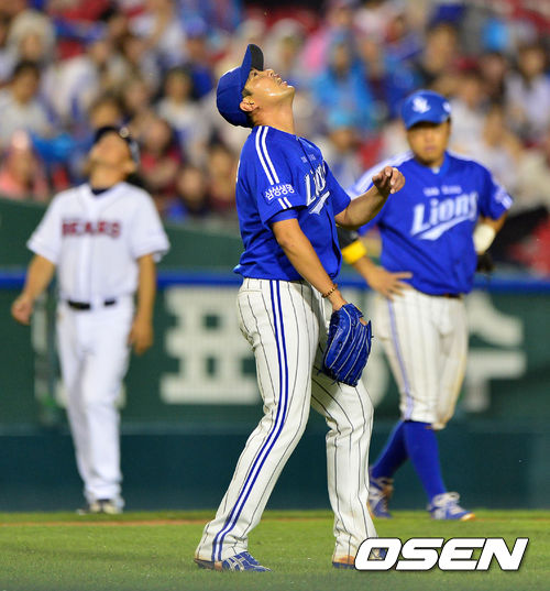 7일 오후 서울 잠실야구장에서 열린 '2013 한국야쿠르트 세븐 프로야구' 두산 베어스와 삼성 라이온즈의 경기, 3회말 2사에서 삼성 장원삼이 두산 최준석의 내야플라이 타구가 조명에 들어가며 내야안타로 연결되자 아쉬워하고 있다.