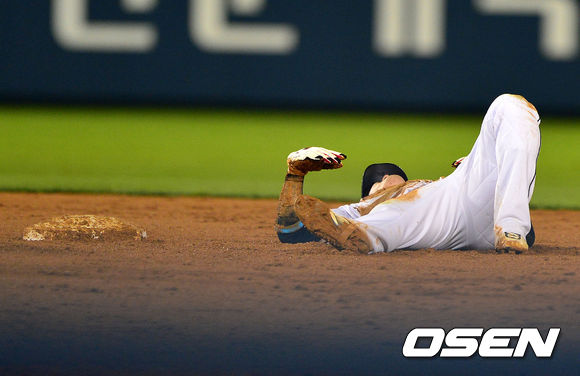 7일 오후 서울 잠실야구장에서 열린 '2013 한국야쿠르트 세븐 프로야구' 두산 베어스와 삼성 라이온즈의 경기, 6회말 2사 1루에서 두산 김재호가 2루 도루에 실패하며 아쉬워하고 있다.