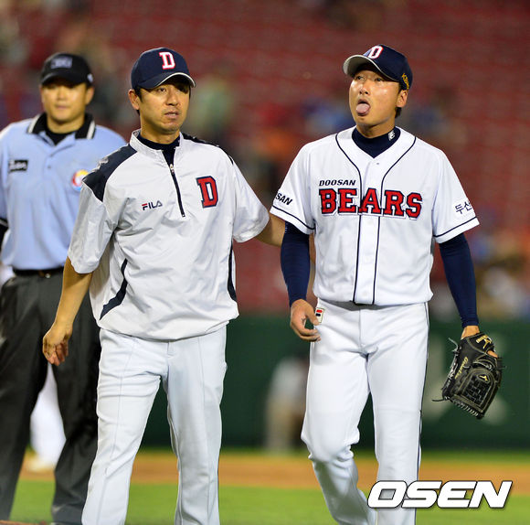 7일 오후 서울 잠실야구장에서 열린 '2013 한국야쿠르트 세븐 프로야구' 두산 베어스와 삼성 라이온즈의 경기, 8회초 무사에서 두산 정재훈이 삼성 김상수의 타구에 맞아 교체되고 있다.