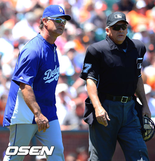 [OSEN=샌프란시스코, 곽영래 기자] 8일(한국시간) 미국 캘리포니아주 샌프란시스코에서 열린 2013 메이저리그 샌프란시스코 자이언츠와 LA 다저스의 경기, 4회초1사 2루 다저스 매팅리 감독이 샌프란시스코 고딘의 견제동작에 항의하고 있다.