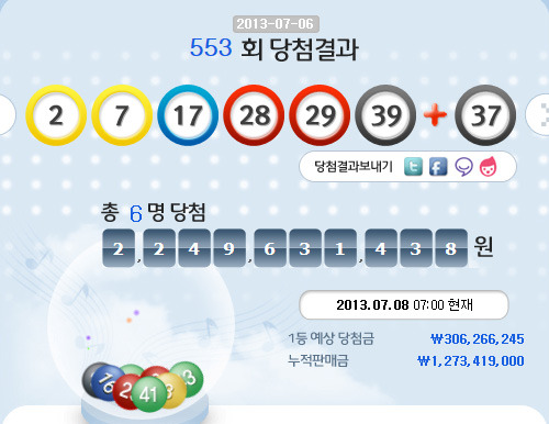 행운의 1등 당첨자는 모두 6명으로 각자 22억 4963만1438원의 당첨금을 받게 된다. 로또553회당첨번호 1등에 뽑히려면 6개 숫자가 모두 일치해야된다.