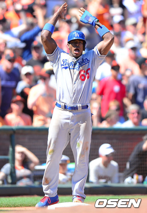 9회초 무사 1루 다저스 곤살레스의 내야안타때 샌프란시스코 2루수 포지의 송구실책으로 3루까지 진루한 1루 주자 푸이그가 환호하고 있다. / soul1014@osen.co.kr