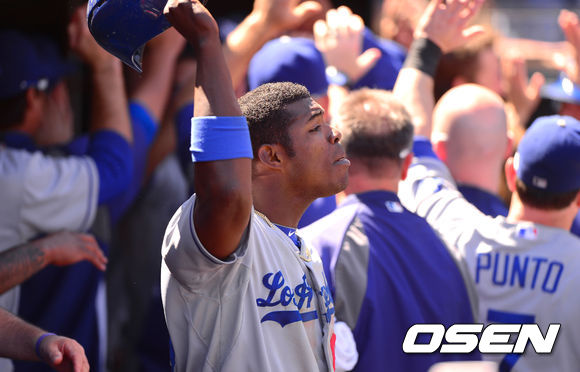 9회초 2사 만루 다저스 A.J.엘리스의 3타점 결승타때 3루주자 푸이그가 홈을 밟은 후 엘리스를 향해 소리 지르고 있다. / soul1014@osen.co.kr