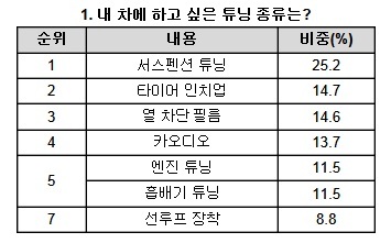 '튜닝을 하고 싶은 이유'는 '운전자의 안전을 위해서(25.1%)'로 나타났으며, '튜닝에 투자할 수 있는 비용'은 '100만 원~300만 원(37%)'이 가장 높게 집계됐다.
