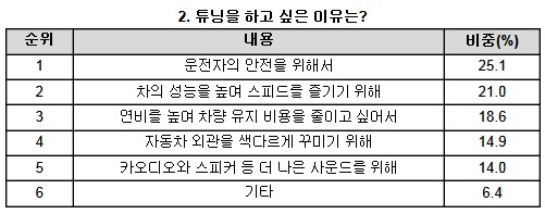 약 80%에 해당하는 응답자들이 남들의 시선을 즐기기 보다는 본인 만족을 위해 튜닝을 하고 싶다는 답변을 선택해 이제 튜닝이 과시용이 아닌 운전의 즐거움을 느끼기 위한 수단으로 바뀌었음을 보여줬다. 또한 비싼 고급차를 구매하기 보다는 약간의 비용을 튜닝에 투자해 효율적으로 성능 및 연비를 향상 시키고 싶다는 응답이 많았다.