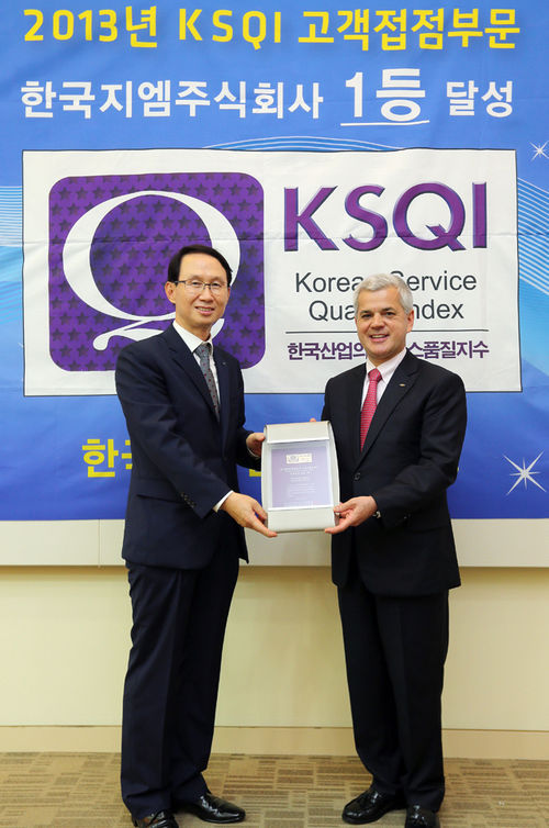 한국지엠주식회사(이하 한국지엠)는 진단평가 기반의 경영컨설팅 전문기관인 한국능률협회컨설팅이 최근 실시한 '2013 한국산업의 서비스 품질지수(KSQI: Korean Service Quality Index)'조사에서 가장 높은 점수를 획득했다.