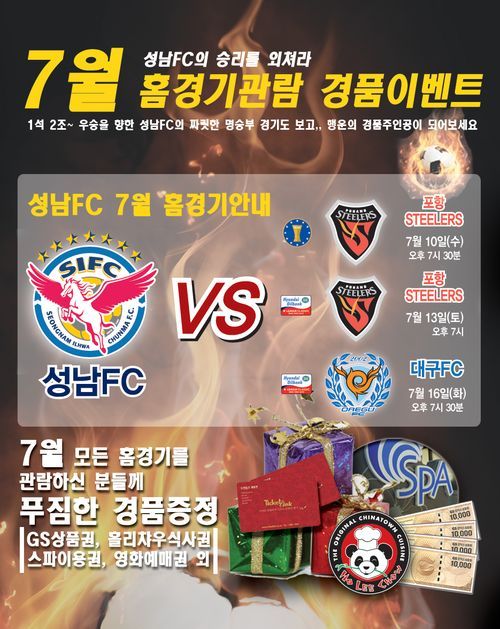 성남은 7월 10일, 13일, 16일 탄천종합운동장에 진행되는 성남의 홈경기를 모두 관람한 선착순 200명을 대상으로 게임을 통해 푸짐한 경품을 제공한다. 성남은 10일 19시 30분 FA컵 16강전에서 포항과 붙는다. 두 팀은 3일 뒤 K리그 클래식 18라운드에서 재대결을 펼친다. 또 성남은 16일 대구를 상대로 19라운드를 치른다.