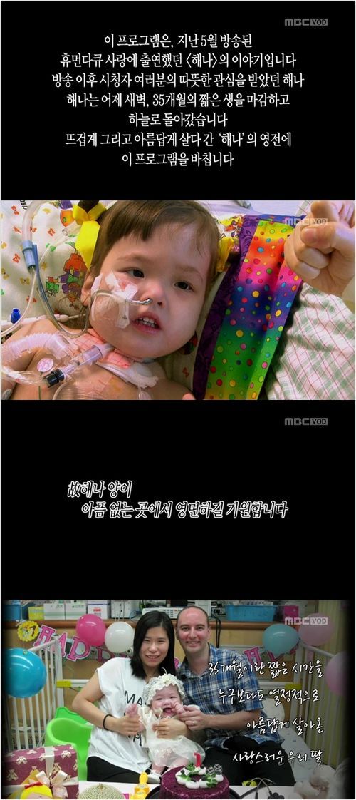 제작진은 자막을 통해 ‘이 프로그램은 지난 5월 방송된 휴먼다큐 사랑에 출연했던 해나의 이야기입니다. 방송 이후 시청자 여러분의 따뜻한 관심을 받았던 해나는 어제 새벽 35개월의 짧은 생을 마감하고 하늘로 돌아갔습니다. 뜨겁게 그리고 아름답게 살다간 해나의 영전에 이 프로그램을 바칩니다’라고 전했다.