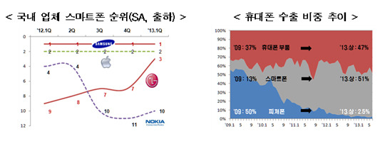 휴대폰은 LG전자의 스마트폰 세계 3위 진입(‘13.1분기) 등 경쟁력 기반 확대로 수출 및 세계 시장 점유율 증가 등 글로벌 입지를 더욱 강화했다.