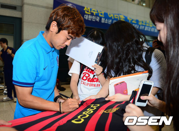9일 오후 인천 국제공항을 통해 귀국한 U-20 대표팀 이광훈이 팬들에게 사인을 하고 있다.