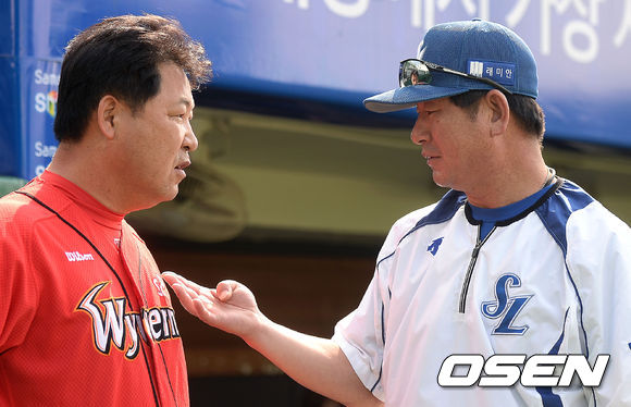 9일 오후 대구 시민운동장에서 열리는 '2013 한국야쿠르트 세븐프로야구' 삼성 라이온즈와 SK 와이번스의 경기전 SK 이만수 감독과 삼성 류중일 감독이 이야기를 나누고 있다.