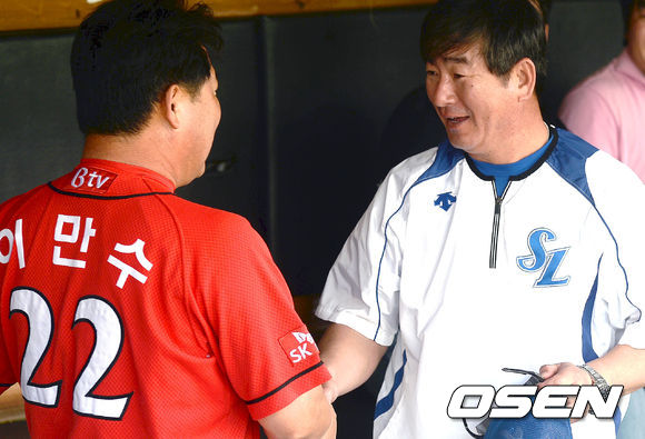 9일 오후 대구 시민운동장에서 열리는 '2013 한국야쿠르트 세븐프로야구' 삼성 라이온즈와 SK 와이번스의 경기전 SK 이만수 감독과 삼성 류중일 감독이 이야기를 나누고 있다.