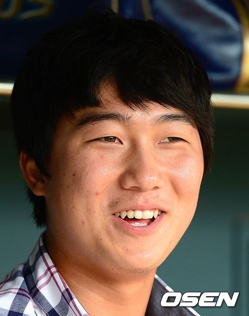 9일 오후 서울 잠실야구장에서 열린 2013 한국야쿠르트 세븐프로야구 LG 트윈스와 NC 다이노스의 경기, 경기에 앞서 지난 8일 2014년 1차 신인지명에서 NC에 지명된 동국대 내야수 강민국(21)이 덕아웃에서 취재진과 이야기를 나누고 있다.