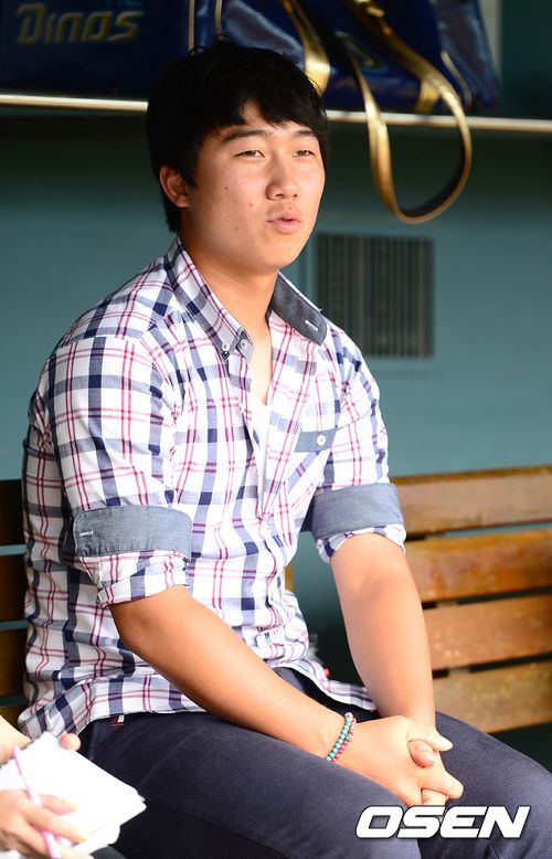 9일 오후 서울 잠실야구장에서 열린 2013 한국야쿠르트 세븐프로야구 LG 트윈스와 NC 다이노스의 경기, 경기에 앞서 지난 8일 2014년 1차 신인지명에서 NC에 지명된 동국대 내야수 강민국(21)이 덕아웃에서 취재진과 이야기를 나누고 있다.