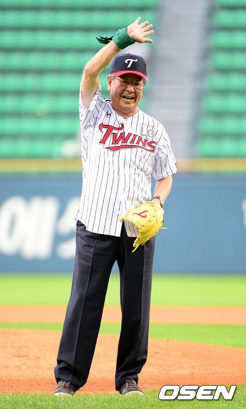 9일 오후 서울 잠실야구장에서 열린 2013 한국야쿠르트 세븐프로야구 LG 트윈스와 NC 다이노스의 경기, 경기에 앞서 배우 최불암이 시구를 마치고 관중석을 향해 인사를 하고 있다.