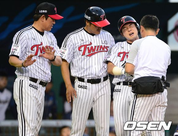 9일 오후 서울 잠실야구장에서 열린 2013 한국야쿠르트 세븐프로야구 LG 트윈스와 NC 다이노스의 경기, 2회말 1사 2,3루에서 LG 현재윤이 NC 찰리의 투구에 맞고 고통스러워하고 있다.