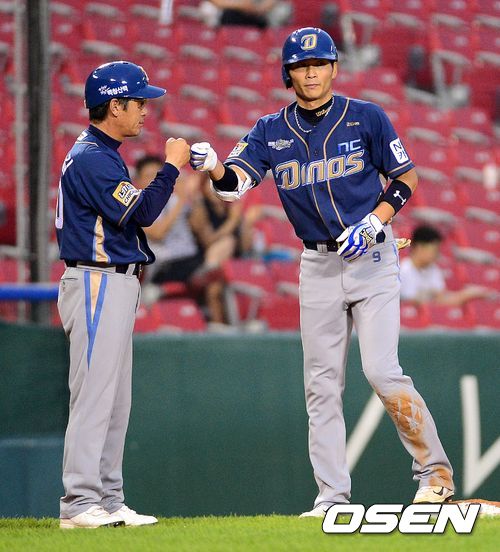 9일 오후 서울 잠실야구장에서 열린 2013 한국야쿠르트 세븐프로야구 LG 트윈스와 NC 다이노스의 경기, 3회초 1사에서 NC 김종호가 좌전안타를 치고 3루에서 이광길 코치와 하이파이브를 하고 있다.