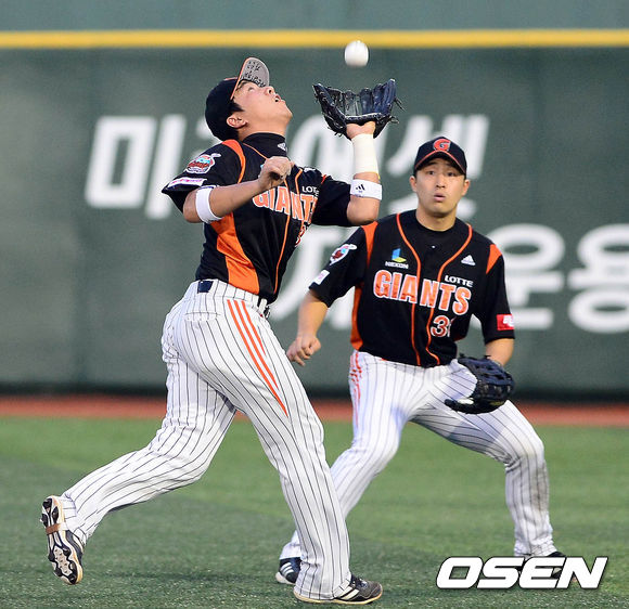 9일 오후 서울 목동구장에서 열린 '2013 한국야쿠르트 세븐 프로야구' 넥센 히어로즈와 롯데 자이언츠의 경기 4회말 1사 강정호의 뜬공을 정훈이 잡고 있다.