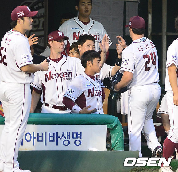 9일 오후 서울 목동구장에서 열린 '2013 한국야쿠르트 세븐 프로야구' 넥센 히어로즈와 롯데 자이언츠의 경기 5회초를 마친 나이트가 덕아웃으로 향하며 동료들과 하이파이브를 하고 있다.