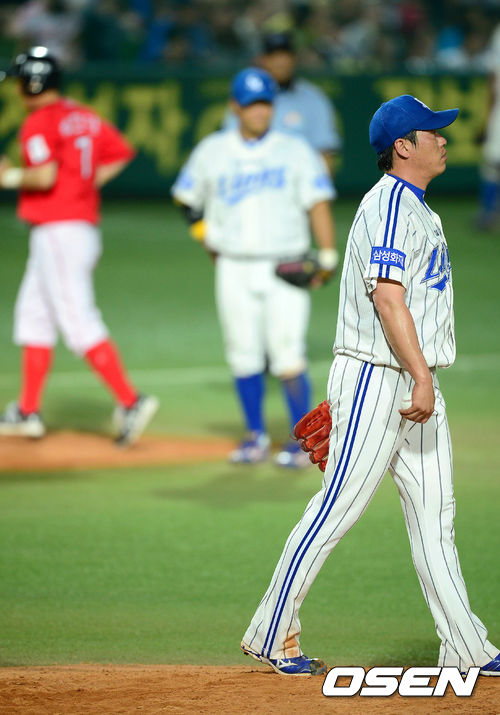 9일 오후 대구 시민운동장에서 열린 '2013 한국야쿠르트 세븐프로야구' 삼성 라이온즈와 SK 와이번스의 경기, 5회초 1사 만루 삼성 신용운이 SK 정상호에게 밀어내기 볼넷을 허용한 뒤 아쉬워하고 있다.