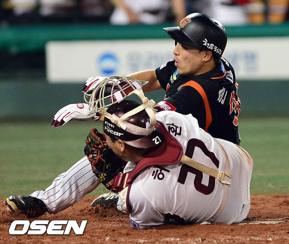 9일 오후 서울 목동구장에서 열린 '2013 한국야쿠르트 세븐 프로야구' 넥센 히어로즈와 롯데 자이언츠의 경기 8회초 2사 만루 전준우의 1타점 적시타에 홈으로 쇄도하던 2루주자 손아섭이 홈에서 태그아웃당하고 있다.