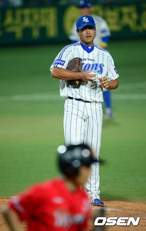 9일 오후 대구 시민운동장에서 열린 '2013 한국야쿠르트 세븐프로야구' 삼성 라이온즈와 SK 와이번스의 경기, 7회초 2사 만루 삼성 김희걸이 SK 조동화에게 밀어내기 볼넷을 허용한 뒤 아쉬워하고 있다.