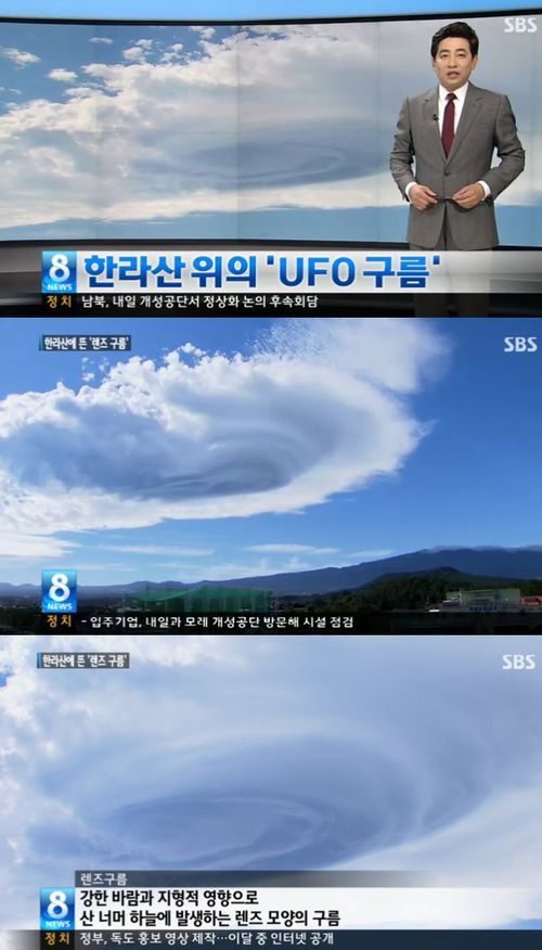 9일 제주도 하늘에 이상한 모양의 구름이 등장했다. 큰 동심원 모양의 대형구름은 마치 UFO를 연상시킬 정도로 거대했다. 원형 구름이 겹겹이 둘러싸여 볼룩하게 솟은 모습이 마치 볼록렌즈를 연상시킨다. 하루종일 한라산 옆에 위치한 구름은 절경을 이뤘다.