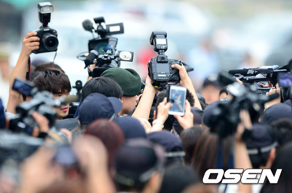 비가 취재진에 둘어싸여 팬들에게 인사를 하고 있다.