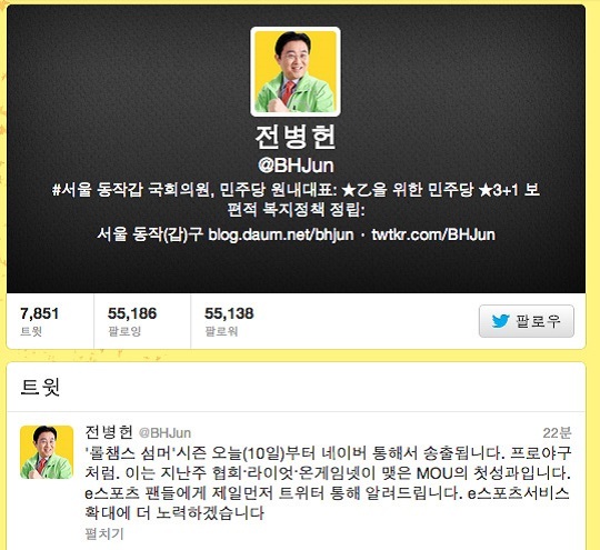한국e스포츠협회 전병헌 회장은 10일 트위터를 통해 “온게임넷 롤챔스 섬머시즌 오늘 경기부터 네이버를 통해서도 시청하실 수 있습니다. 이는 지난주 협회·라이엇게임즈·온게임넷이 맺은 MOU의 첫 성과 입니다. e스포츠 팬들에게 제일 먼저 트위터를 통해 알려드립니다. 앞으로도 한국e스포츠협회는 팬들을 위한 e스포츠 서비스 확대에 지속적으로 노력해 갈 것입니다”라고 밝혔다.
