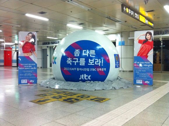 진격의 축구공을 가장 쉽게 볼 수 있는 곳은 서울 지하철 충무로역의 3-4호선 환승지역. 이곳에는 2.5m 지름의 초대형 축구공이 지나가 시민들의 눈길을 끌고 있다.
