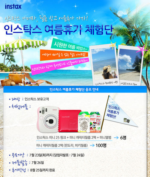 이번 ‘인스탁스 여름휴가 체험단’은 인스탁스 보유자를 대상으로 23일까지 모집하며, 총 106명에게 인스탁스 카메라와 캐릭터 필름을 제공한다. 신청자 중 6명을 선정해 인스탁스 미니25 카메라 1대, 미니필름 2팩, 미니앨범을 체험 제품으로 전달하며, 그 외 100명에게는 캐릭터필름을 2팩씩 증정한다.
