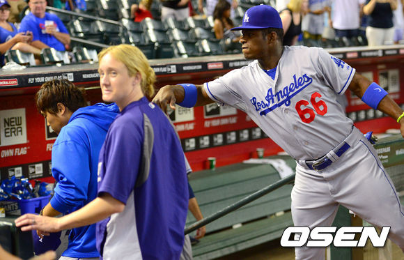 [OSEN=피닉스(미국 애리조나),곽영래 기자] 10일(한국시간) 미국 애리조나 피닉스 체이스필드에서 열린 2013 MLB 애리조나 다이아몬드백스와 LA 다저스의 경기에 앞서 다저스 푸이그가 류현진의 뒷통수를 때리며 장난치고 있다