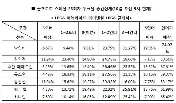 국민체육진흥공단(www.kspo.or.kr)이 발행하는 체육진흥투표권 수탁사업자인 스포츠토토 공식 온라인 발매 사이트인 베트맨(www.betman.co.kr)은 오는 11일 캐나다 온타리오에서 열리는 미국여자프로골프(LPGA)투어 '매뉴라이프 파이낸셜 LPGA 클래식' 1라운드를 대상으로 한 골프토토 스페셜 28회차에서 전체 참가자의 74.07%가 박인비의 언더파 활약을 예상했다고 밝혔다.