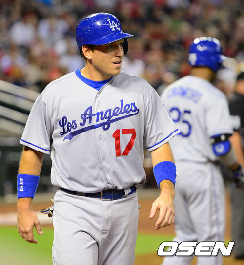 10일(한국시간) 미국 애리조나 피닉스 체이스필드에서 열린 2013 MLB 애리조나 다이아몬드백스와 LA 다저스의 경기, 2회초 2사 3루 다저스 놀라스코 선발투수가 선취 1타점 적시타때 3루 주자 A.J.엘리스가 동료들의 축하를 받고 있다
