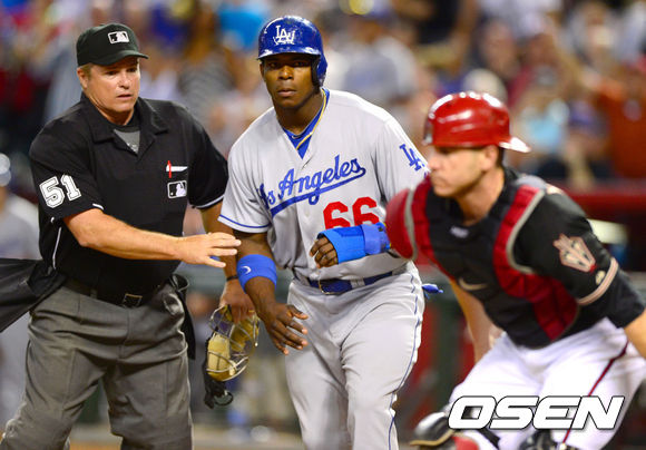 10일(한국시간) 미국 애리조나 피닉스 체이스필드에서 열린 2013 MLB 애리조나 다이아몬드백스와 LA 다저스의 경기, 5회초 무사 만루 다저스 곤살레스가 희생플라이를 날렸다. 애리조나 중견수의 실책을 틈타 홈으로 쇄도한 1루 주자 푸이그가 몬테로 포수와 충돌 후 노려보고 있다.