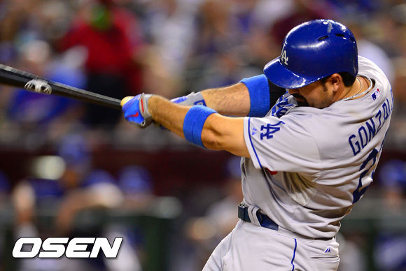 10일(한국시간) 미국 애리조나 피닉스 체이스필드에서 열린 2013 MLB 애리조나 다이아몬드백스와 LA 다저스의 경기, 5회초 무사 만루 다저스 곤살레스가 희생플라이를 날리고 있다. 이후 애리조나 중견수의 실책으로 2루 주자 크로포드까지 득점했다.
