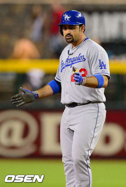 10일(한국시간) 미국 애리조나 피닉스 체이스필드에서 열린 2013 MLB 애리조나 다이아몬드백스와 LA 다저스의 경기,5회초 무사 만루 다저스 곤살레스가 희생플라이 타구를 날리고 박수를 치고 있다. 곤살레스의 희생플라이 타구때 애리조나 중견수의 실책으로 다저스는 2득점했다.