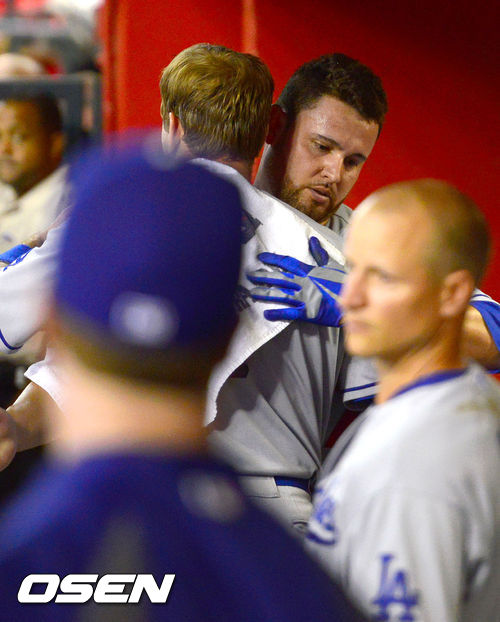 10일(한국시간) 미국 애리조나 피닉스 체이스필드에서 열린 2013 MLB 애리조나 다이아몬드백스와 LA 다저스의 경기,7회말 이닝종료 후 다저스 선발투수 놀라스코가 A.J.엘리스와 포옹을 하고 있다.