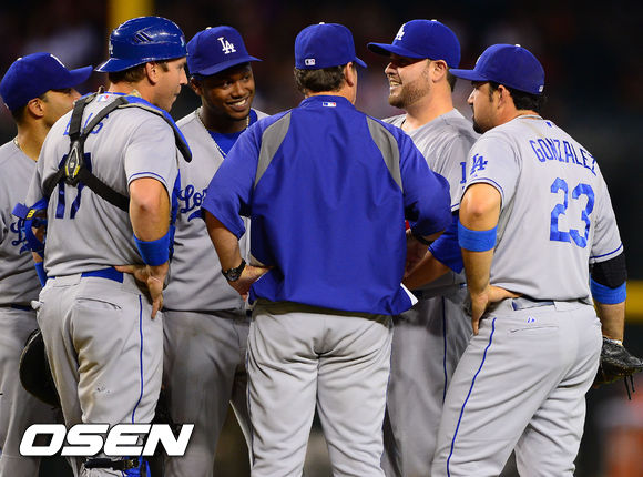 10일(한국시간) 미국 애리조나 피닉스 체이스필드에서 열린 2013 MLB 애리조나 다이아몬드백스와 LA 다저스의 경기,7회말 2사 1루 다저스 놀라스코 선발투수가 마운드에 오른 허니컷 코치와 하이파이브를 하고 있다