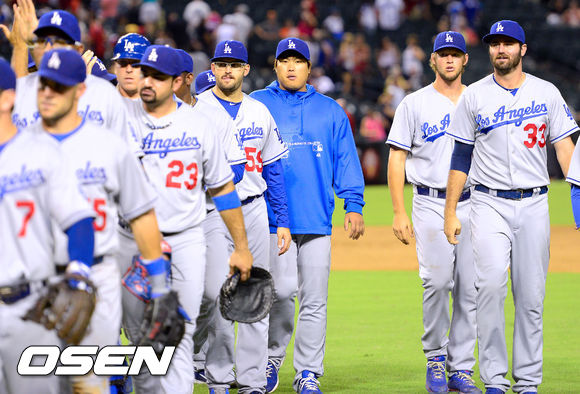 경기종료 후 다저스 류현진이 동료들과 승리의 기쁨을 나눈뒤 그라운드를 빠져나가고 있다. / soul1014@osen.co.kr